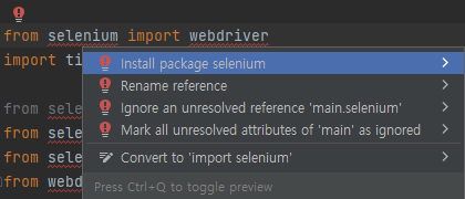 빨간줄이 그인 selenium을 클릭후 alt+enter를 눌러 주면 아래와 같이 여러 영어 문장들이 나타납니다. 이 중에서 맨 윗줄에 있는 install package selenium을 클릭하여 설치해주시면 됩니다.