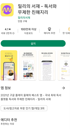 먼저 플레이스토어에서 밀리의 서재 앱을 설치합니다.