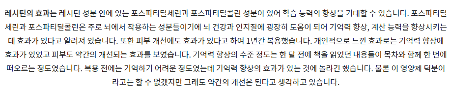 이전에 레시틴의 효과와 효능에 대해서 설명한 적이 있으니 아래의 사진을 잘 참고하시면 될 것 같습니다.