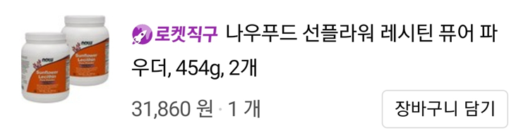Sunflower Lecithin now food 파우더 형태 제품을 각 한 통에 454g을 두 통 주문해서 31,860원으로 구매했습니다.