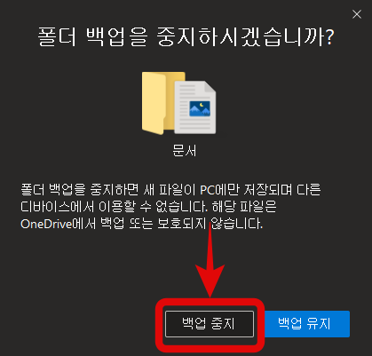 "폴더 백업을 중지하시겠습니까?"라는 문구와 함께 백업을 중지시킬건지 백업을 그대로 유지시킬 건지를 선택하는 창이 나가는데 우리는 백업을 중지할 것이기 때문에 '백업 중지' 버튼을 눌러줍니다.