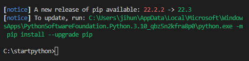 출력결과=>C:\startpython>C:/Users/jihun/AppData/Local/Microsoft/WindowsApps/python3.10.exe c:/startpython/개요.py