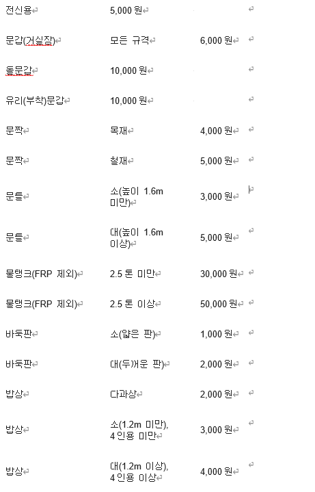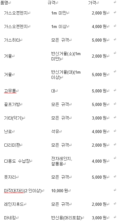 아래는 인천 서구 기준 폐기물 스티커 가격표 입니다.