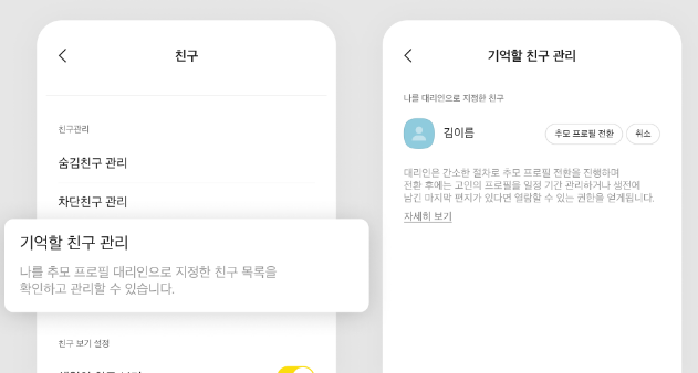 마지막 메시지 남기기: 추모 프로필을 통해 대리인에게 미리 작성한 마지막 메시지를 남길 수 있으며, 이 메시지는 추모 프로필을 통해 열람할 수 있습니다.