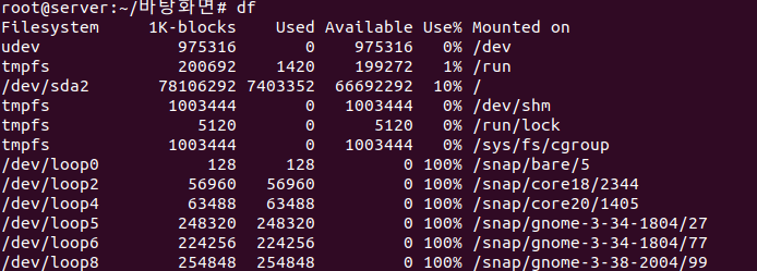파일디스크 공간을 출력한다. 마운트된 장치의 설명도 볼 수 있다.